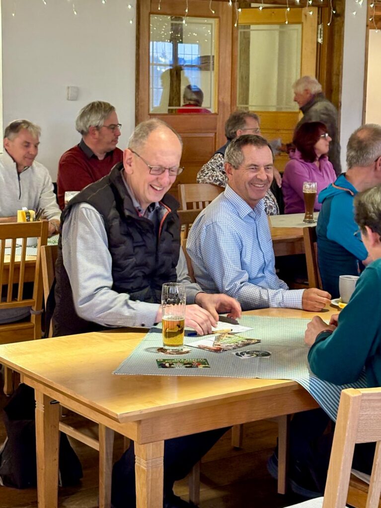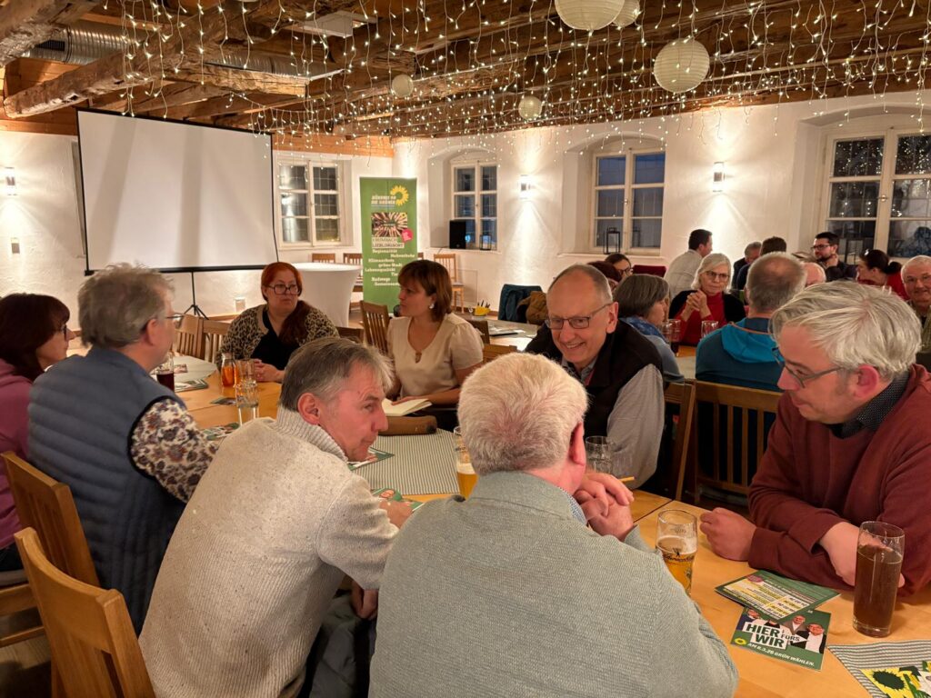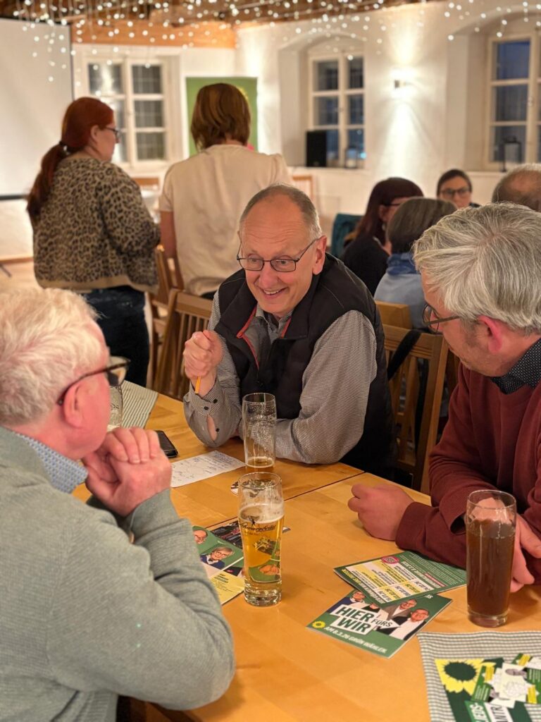Anschließend wurde das eigentliche Stammtischformat lebendig: Rund 30 Gäste verteilten sich auf mehrere Tische, an denen direkt diskutiert und nachgefragt werden konnte. Themen gab es reichlich – vom Ausbau des ÖPNV über bezahlbaren Wohnraum und die Zukunft des Kreisklinikums bis hin zur anstehenden Kommunalwahl. Der direkte Austausch auf Augenhöhe stand im Mittelpunkt. Nach einer gewissen Zeit wechselten die Mandatsträgerinnen und -träger die Tische, sodass jede und jeder die Möglichkeit hatte, mit allen ins Gespräch zu kommen.