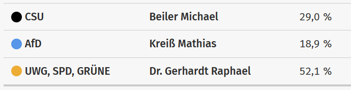 Der parteilose Raphael Gerhardt, von SPD, UWG und uns Grünen als Bürgermeisterkandidat nominiert, hat sich gegen seine Mitbewerber von der CSU und der AfD durchgesetzt. Das er das gleich im ersten Wahlgang geschafft hat zeigt wohl, welch integrative Fähigkeiten der Mann hat. Und wir haben unseren Anteil an dem Erfolg.