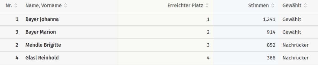 Bei der Stadratswahl haben wir unsere beiden Sitze verteidigen können, wogegen CSU(2), UWG(1) und SPD(1) Mandate verloren haben. Unsere bisherige Stadträtin Johanna Bayer wurde wiedergewählt. Der zweite Sitz ging an ihre Mutter Marion Bayer. Brigitte Mendle, die seit 25 Jahren für uns im Stadtrat saß, erreichte Platz 3 und ist somit erste Nachrückerin.